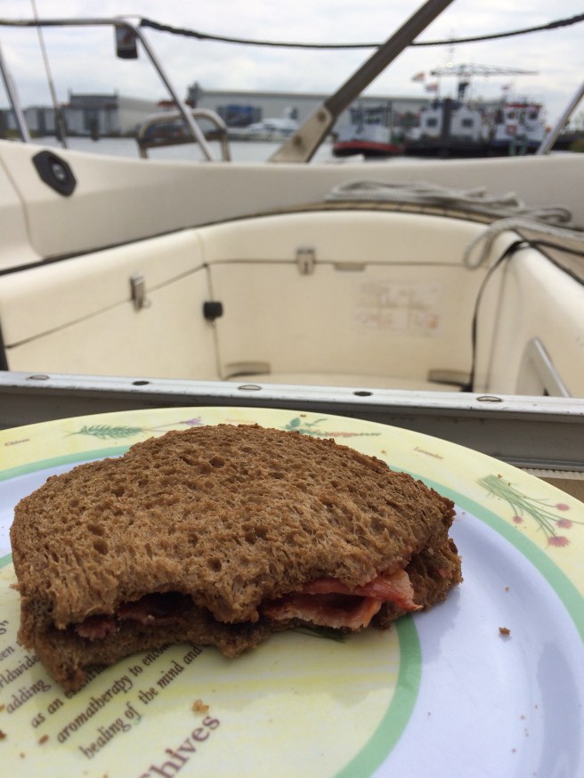 Looking good for a more peaceful sailing holiday. Bacon sandwich looks good too.