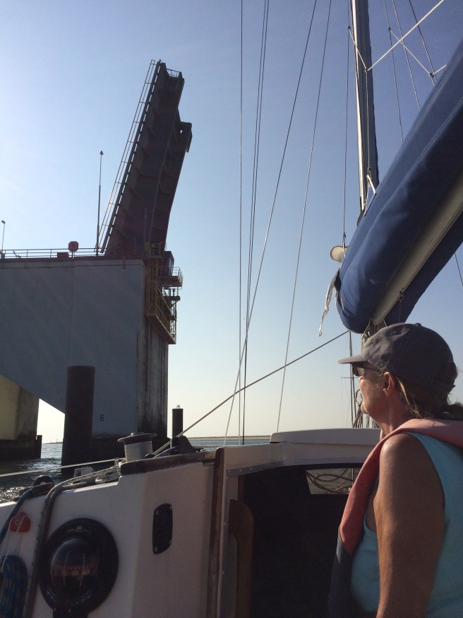 But as we approached the span, looking up, it all looked very different. There was another yacht waiting for the bridge to lift so with my recently, and expensively, installed radio aerial, windex, tricolour etc threatening to make bridge contact, we waited with them.